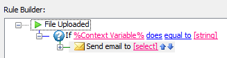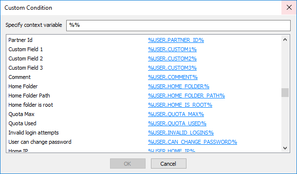 The Context Variable Condition is triggered when a context variable meets specific criteria: if %Context_Variable% is/is not, does/does not, equal/less than/greater than/, contain/start with a specified value. For example, %USER.HOME_FOLDER_PATH% to provide entire path to a user's home folder (for example, C:\InetPub\EFTRoot\MySite\Usr\asmith).