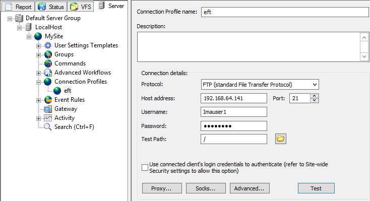 A Connection Profile is a connection settings template to be used in Event Rules that contains the server connection settings. A profile includes the Profile Name, Description, and Connection details such as protocol, host address, credentials, proxy, socks, and so on. A Test button is provided to verify the specified connection options. After you've created the profile on the Site, you can specify it in Copy/Move and Download Actions so that you don't have to define it every time you create a Copy/Move or Download Event Rule. (Connection Profiles require HTTPS, SFTP, or FTPS to connect as the server.)