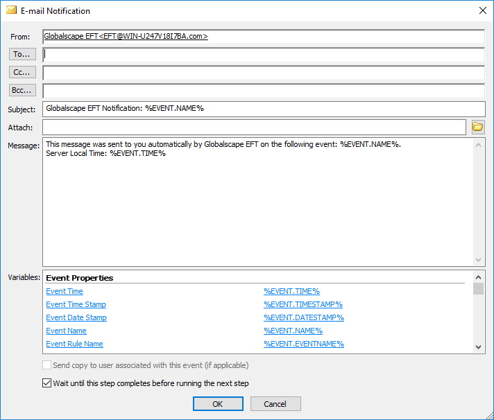 For example, when you create an Event Rule, you can configure an email to be sent when the Event occurs. In the Edit Mail Template dialog box, you can send the default email or you can add one or more variables listed in the Variables box at the bottom of the email. Each of the variables defined in EFT is described in Connection Variables; however, not all of the variables described below are available in the email notification. In the email notification, you can specify to display the text along with the value of the variable (e.g., File Creation Date: 8/28/2022), or just the value of the variable (e.g., 8/28/2022).