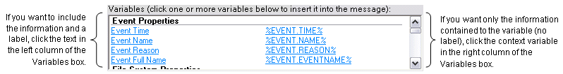 For example, if you click Event Time in the left column the label "Event Time" and the time are displayed. If you select %EVENT.TIME% in the right column, the time will be displayed without a text label.