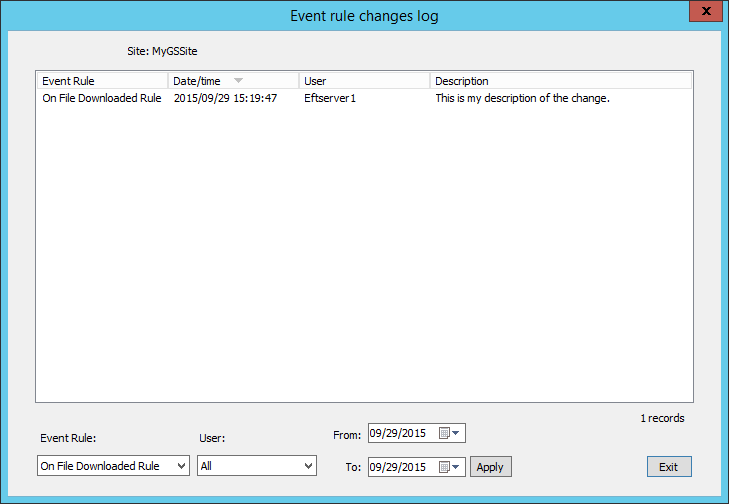 By default, only the selected Event Rule, all users, and changes on today's date are displayed. You can choose to show changes for all Event Rules, specific users, and a date range, then click Apply.