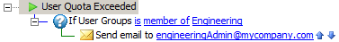 You can use the If User is a member of Condition to apply the Event Rule to one or more specific Groups (By default, all Rules apply to all users.) For example, suppose the Engineering department has its own user administrator for EFT and you want the administrator to get an email when one of the user accounts exceeds its quota. You would set up a User Quota Exceeded Event with an If User Groups Condition and a Send notification email Action, as described below.