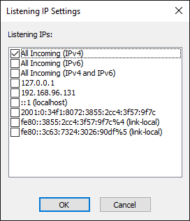 - Click Configure to specify one or more IP addresses. The Listening IP Settings dialog box appears.