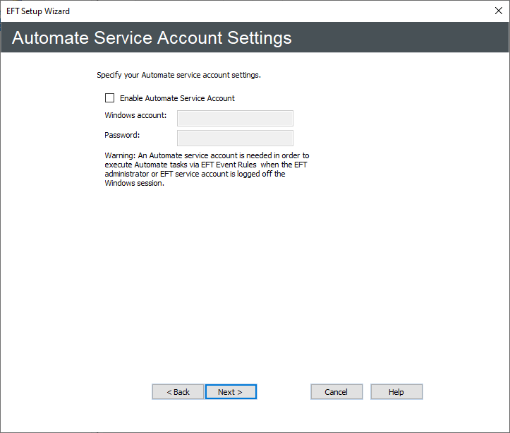The Automate Service Account must be enabled and provided Windows account credentials so that the Automated Workflows can continue to run in event rules when the Windows session is logged out or locked or EFT server service account is logged out. Select the Enable Automatic Service Account check box and provide the Windows credentials.
