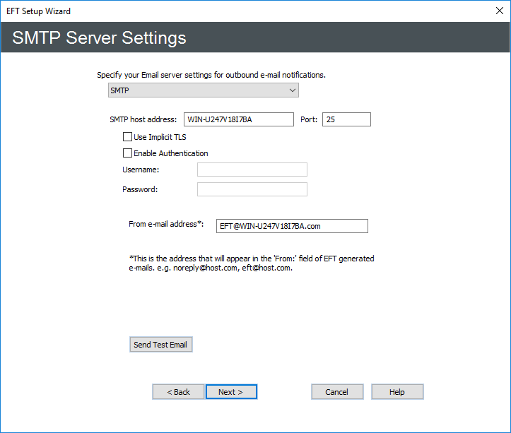 - In the From email address box, specify the email address for email notifications (such as those triggered by Event Rules). This is the address that appears in the From box of emails sent by EFT. For example, type noreply@serverhost.com.