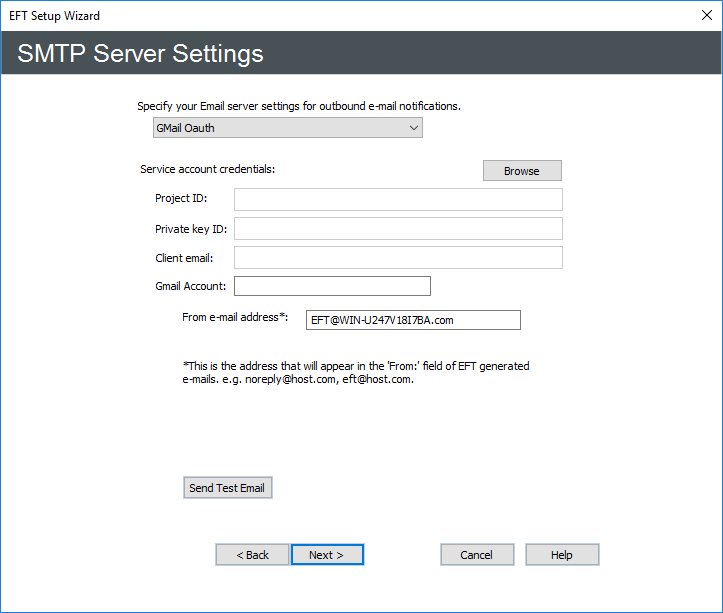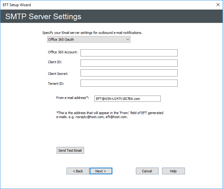 - To specify your email server settings for outbound email notifications, click the drop-down box and select SMTP (default), GMail Oauth, or Office 365 Oauth. The options on this page of the wizard change based on your selection.