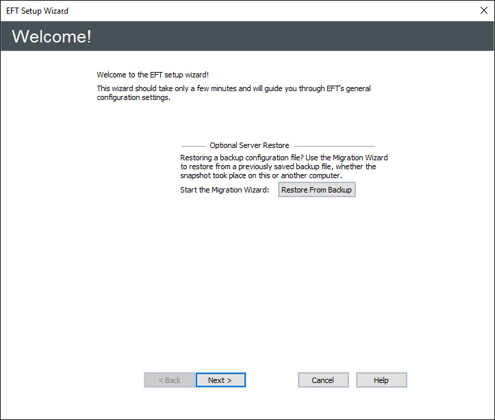 - If you are restoring from a backup, click Restore from Backup, then refer to Backing Up or Restoring Server Configuration for the procedure.