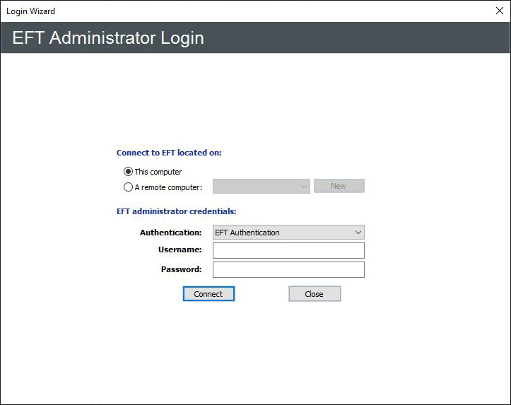 - EFT Authentication - Choose this option to log in with an EFT-specified administrator account, such as the one you created during installation.