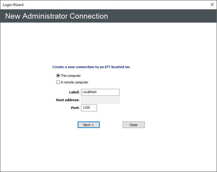 Leave This computer selected, then specify the Label for the local connection. By default, the label is LocalHost. Because LocalHost is a very common label, it is a good idea to change the label to something that is easily identifiable in error logs, reports, and remote connections. For example, GS_EFTS. You can label EFT anything you want; the EFT name is not dependent upon the computer name. The EFT Administrator Login page appears.