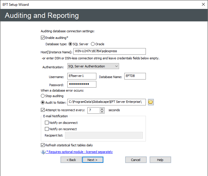 - The Refresh statistical fact tables daily check box is selected by default. If you do not want the database fact tables to be refreshed as part of EFT's hard-coded nightly cleanup routine (at midnight), then clear the check box.