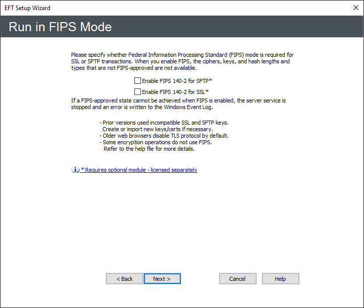 - Click an option, then click Finish. If you chose FIPS mode for SSL and/or SSH, prompts appear explaining that EFT has entered FIPS mode. Click OK to dismiss the prompts.