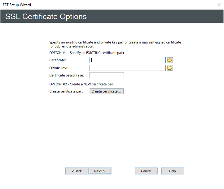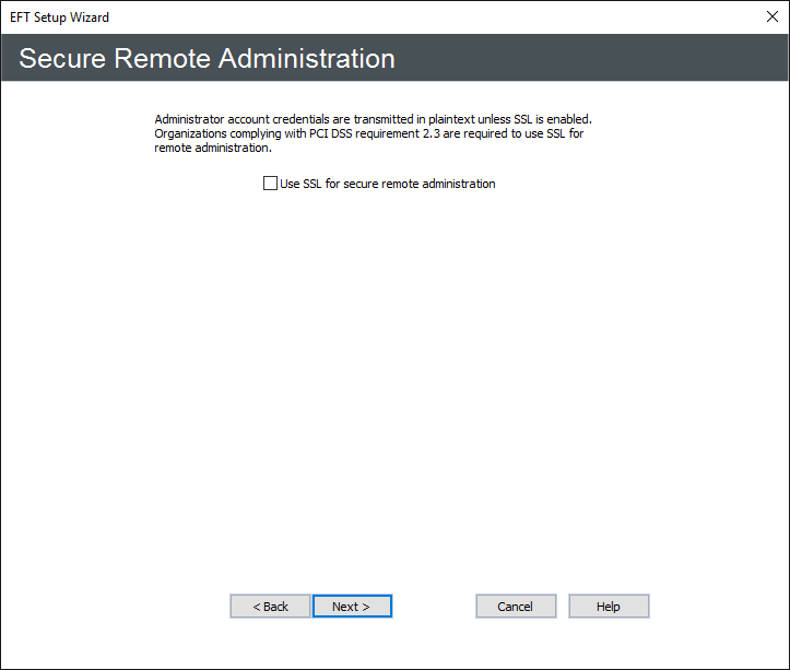 - Administrator account credentials are transmitted in plaintext unless SSL is enabled. Organizations complying with the PCI DSS are required to use SSL for remote administration. To enable secure remote administration, select the Use SSL for secure remote administration check box, and then click Next. The SSL Certificate Options page appears.