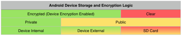 Starting with Android 3.0 you can enable whole disk encryption; however, once you enter your pin code, your device is decrypted device-wide, and nothing prevents the user or another app on the device (deliberately run by the user or otherwise) from accessing the data directory for any other app. To prevent this breach of data privacy, MTC leverages Android’s so-called "internal" data storage, a relatively small partition of the overall non-removable physical storage that acts like a data sandbox, preventing both the user and app from accessing files downloaded from EFT into MTC’s cache or offline vault. Contrast this "internal" storage with the so-called "external" storage (not to be confused with the physically inserted SD card) which represents the remainder of the non-removable hard-drive and allows any app on the device to access any other apps’ data. The downside of using internal storage is that it is usually about a tenth or less of the overall non-removable disk space. Using a physically inserted SD for storage is simply out of the question because neither encryption nor data privacy are extended to this truly external, removable storage media type. Below is a graphic that helps illustrate Android’s various partitions and how encryption and privacy (data sandboxing) apply. MTC follows the purely green path. However, keep in mind that data will only be encrypted if the device-wide encryption is enabled on the device.