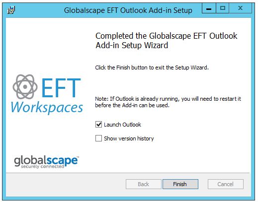 To use the Workspaces with Outlook, you must first install the EFT Outlook Add-In. You can use the deployment script available on the Workspaces File Send tab of the Site to deploy it to multiple computers at once in any deployment tool that you normally use, or you can install it with the EFT Outlook Add-In installer as described below.