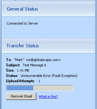 The Add-In will try to automatically recover from problems such as loss of connectivity with EFT during a transfer. If the Add-In experiences an “Unrecoverable Error” while managing a package, the Recover Email button appears. An unrecoverable error is a more serious error that the Add-In cannot resolve on its own, such as a file system error caused by EFT running out of disk space. These types of errors will usually require an administrator to resolve.