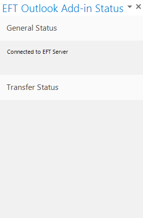 The EFT Outlook Add-In includes a Status pane through which you can view whether you are connected to EFT and the status of email attachments being sent. By default, the Status pane is hidden. The pane appears on the right side of the main Outlook window.