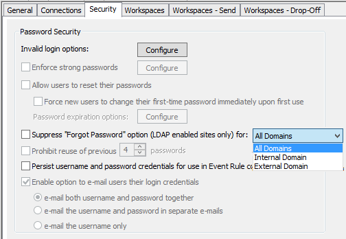 On an LDAP Site, to hide the Forgot Password option in the Web Transfer Client, select the Suppress "Forgot Password" option check box, then specify whether you want it hidden for All Domains, the Internal Domain, or the External Domain. (Not available on non-LDAP Sites.)