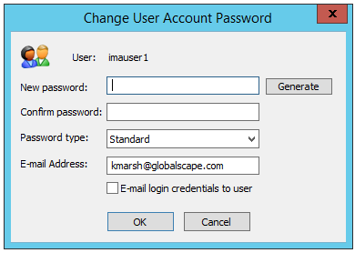 To email the user's password, type the email address and select the email login credentials check box. If the email address is configured in the User Details, the Email Address box is completed automatically. If you type an invalid email address, an error message appears. (SMTP must be configured on EFT to email the user.)