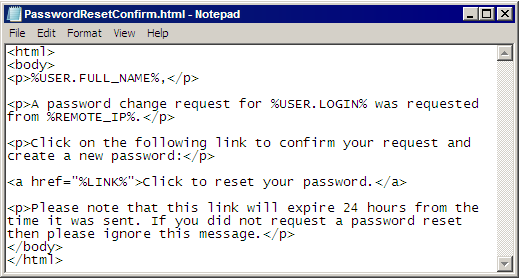 Edit the text as needed, being careful not to delete the variables (%USER.FULL_NAME%, %USER.LOGIN%, %REMOTE_IP%, %LINK%), then save the file and close the text editor.