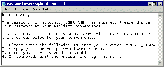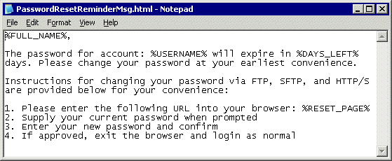 Edit the text as needed, being careful not to delete the variables (%FULL_NAME%, %USERNAME%, %DAYS_LEFT%, %RESET_PAGE%), then save the file and close the text editor.