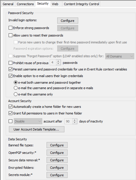On a high security-enabled Site, password history is enabled by default. If a user attempts to change a password to one of the specified number of passwords previously used for that account, EFT denies the password change request. The option is available at the Site, User Setting, and per user.