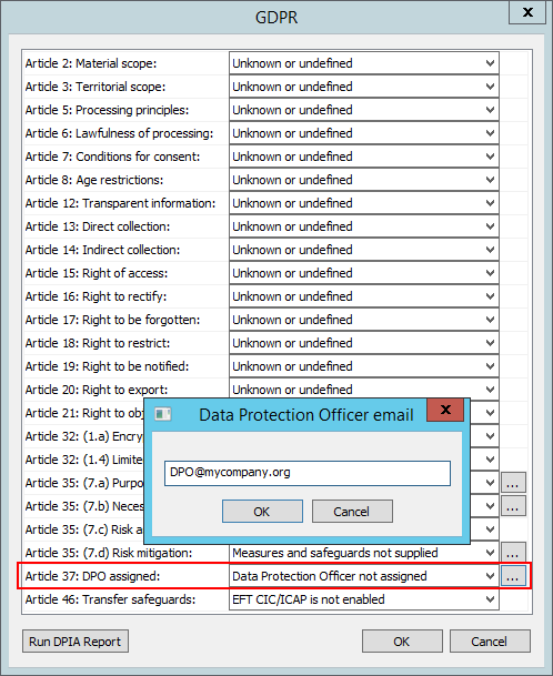 Next to Article 37, click the drop-down list to add an email address for the DPO. If a DPO is not necessary, you can choose one of the following: Data Protection Officer not assigned, Not applicable (N/A), or you are deploying Other or external measures.