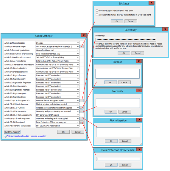 Next to GDPR & DPIA, click Configure. The GDPR Settings dialog box appears.