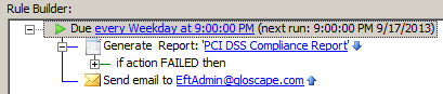 When you create a high security-enabled Site, EFT creates a Report Event Rule automatically. The Report Event Rule generates a PCI DSS Compliance Report once per week using the Generate Report Action. The report is converted to HTML and then emailed using the Send notification email Action and the %FS.REPORT_CONTENT% variable. You can edit the Rule to specify when to generate the report and to whom to send the report.