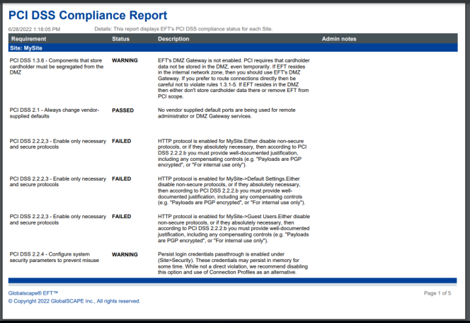 The RCM module includes the ability to audit EFT for compliance with the PCI DSS requirements. EFT scans all PCI DSS requirements addressed in EFT, and then reports on the compliance status of each requirement (Pass, Fail, or Warning). The report also provides a description of the requirement tested for each item. For failed requirements, the report presents a reason the non-compliant setting was used, if you provided one at the time that particular setting was disabled/changed.