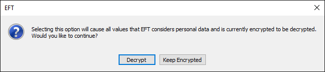 Disable encryption of personal data by selecting Personal Data is not encrypted by EFT, then click Decrypt. After EFT finishes decrypting, you can supply a new Personal Data encryption key.