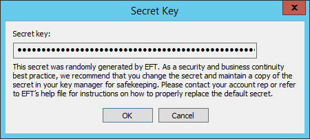 Select Personal data is encrypted by EFT, then click the browse icon to provide a new secret key. The key must be exactly equal to 64 hexadecimal characters.