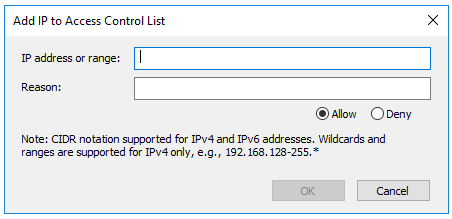To add an IP address to the rules, click Add. The Add IP to Access Control List dialog box appears.