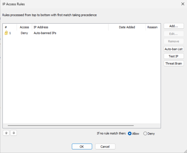 The IP Access Rules dialog box appears. The default configuration is to deny access to all external IPs as well as banned IP addresses. By default, if no rule matches an IP address, then the IP is denied.