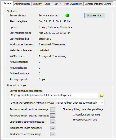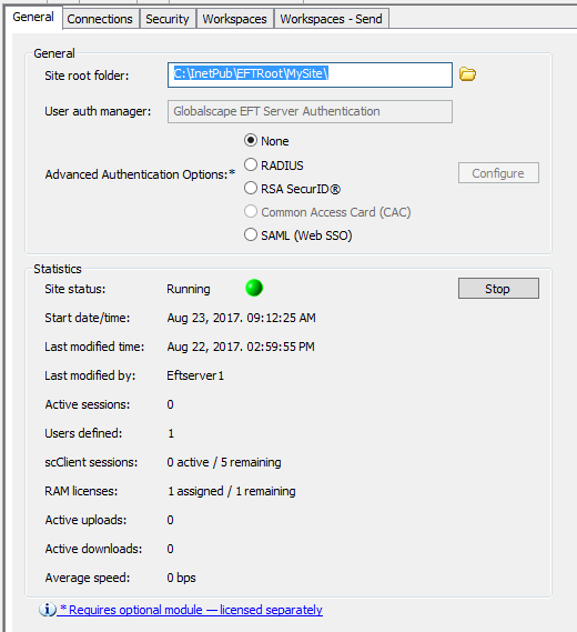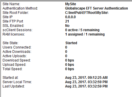 The Remote Agents license (RAM licenses) status can be viewed in the EFT administration interface, on the Status tab's Site node: