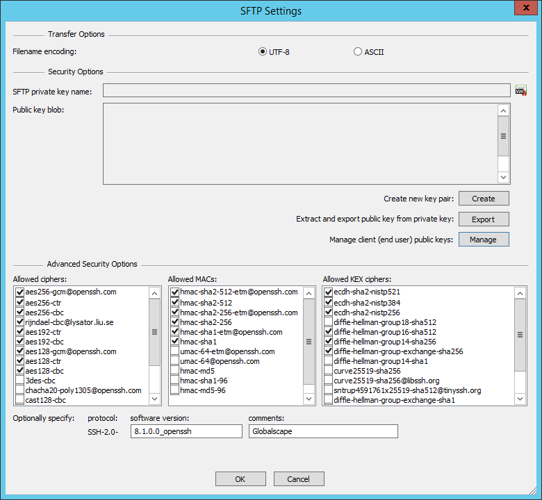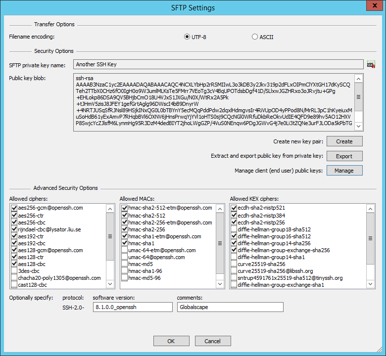 If you enabled SFTP and created keys when you defined the Site, the key name and blob appear in the SFTP Settings dialog box.