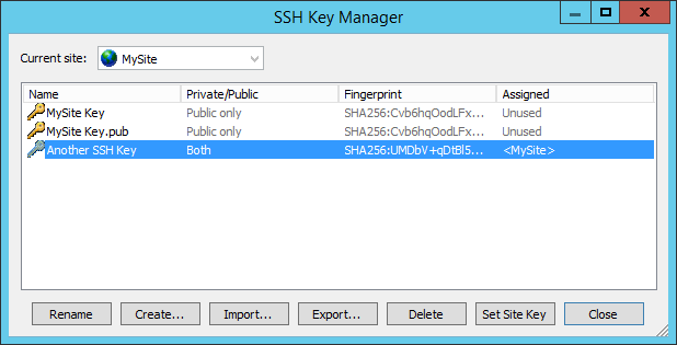 In the SSH Key Manager dialog box, click the Private/Public key that you want to assign to the Site, click Set Site Key, then click Close. The assigned SFTP private key name and blob appear in the dialog box.