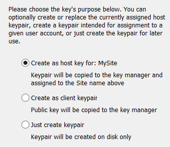 Before you can enable and configure SFTP on the Site, you must create or import an SFTP key defined on the Site. Be sure to select Create as hot key for; <site_name> before you click Finish.