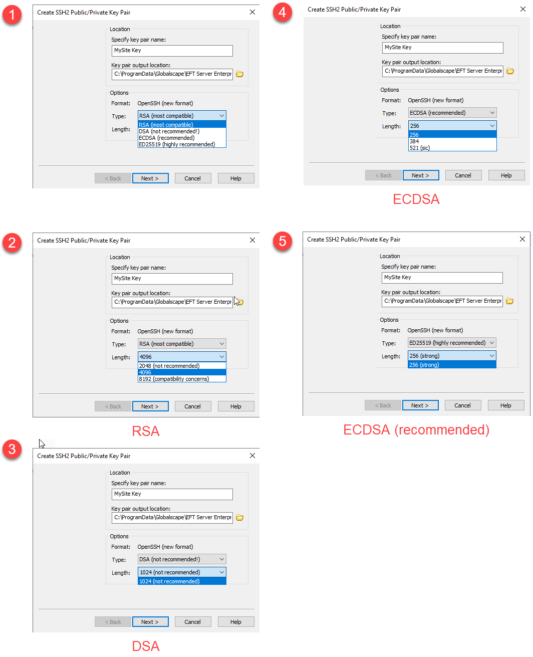 RSA 4096 are the defaults for new installations. See https://www.ssh.com/ssh/keygen/ for more information. Key algorithms with a single choice show that length value appears dimmed, as those cannot be edited.
