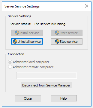 The Server Service Settings dialog box is used to administer the EFT server service, either locally or remotely. Using this dialog box, you can uninstall/install the service and stop/start the service instead of opening the Services Microsoft Management Console (MMC) snap-in.