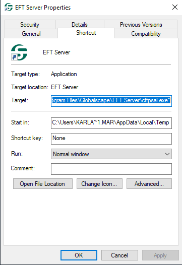 Right-click the EFT administration interface shortcut created when you installed EFT (or create one), then click Properties. The Properties dialog box appears.