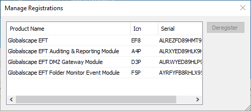 In the About EFT Server dialog box, click Manage. The Manage Registrations dialog box appears.
