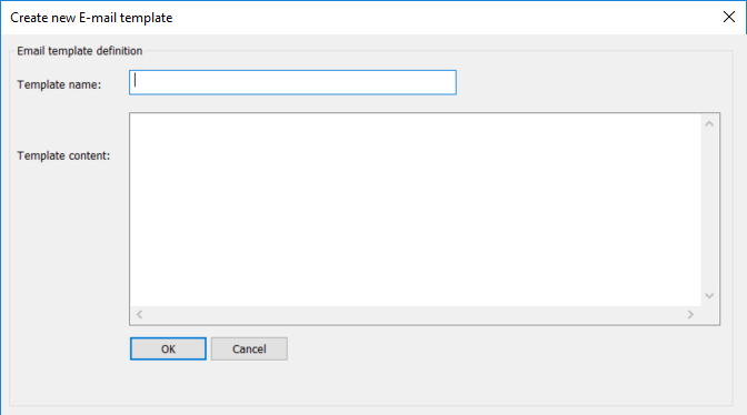 Provide a Template name, then add the Template content. You can create an HTML version with HTML tags (<html> <body> <p> and so on) and variables, such as %USER.FULLNAME%, or a TXT version without the HTML tags, and using variables.