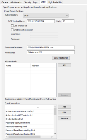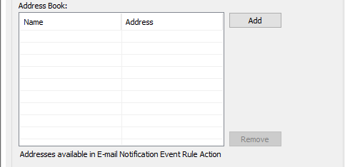 In the Address Book area, click Add to add names and email addresses of recipients of EFT Event notifications. Add only the addresses that you want to receive email notifications. The email addresses will be added automatically to the To box in the Send notification email Action in Event Rules.