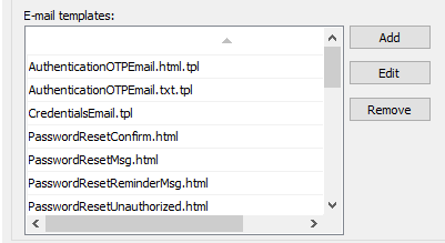 In the Email templates area, you can add, edit, and remove email templates used by EFT and Workspaces to send notifications regarding authentication, credentials, passwords, and PGP key expiration errors. (Refer to EFT Messages and Templates for details of the templates.)