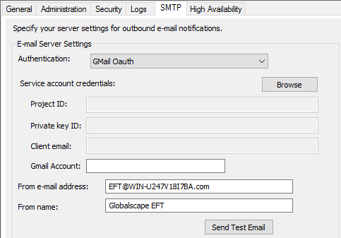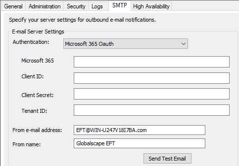 The Email Server Settings area on EFT's SMTP tab are completed automatically when you define them in the Server Setup Wizard during installation. You must configure the mail server settings for the EFT to send email notifications when Events occur, including the address for the outgoing mail server, an address for the administrator, and other details described below.