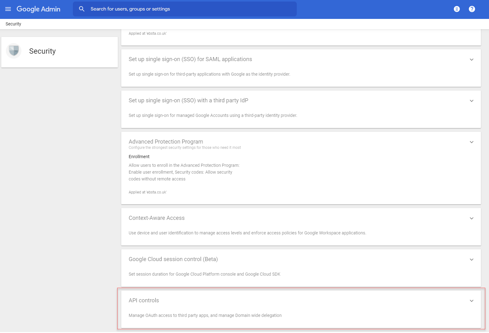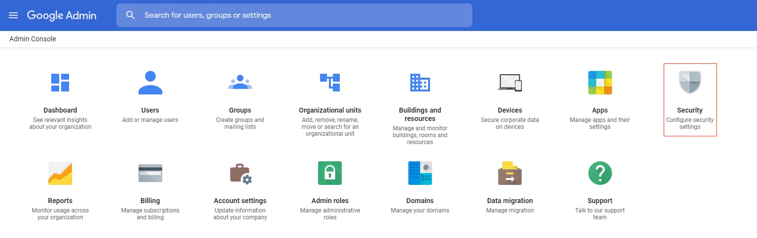 Login to the Gsuite Admin Console: https://admin.google.com, and then click the Security icon.