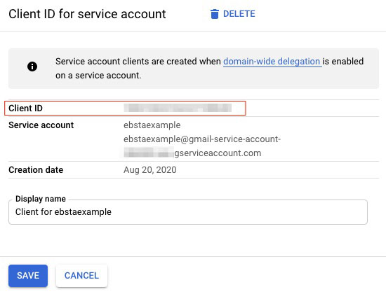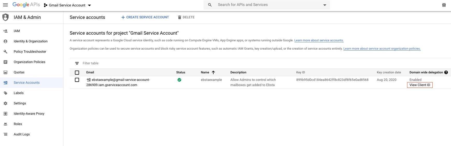 menu in the GCP console and selecting IAM & Admin > Service accounts. Click View Client ID and then copy it onto your clipboard.