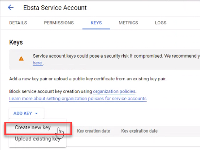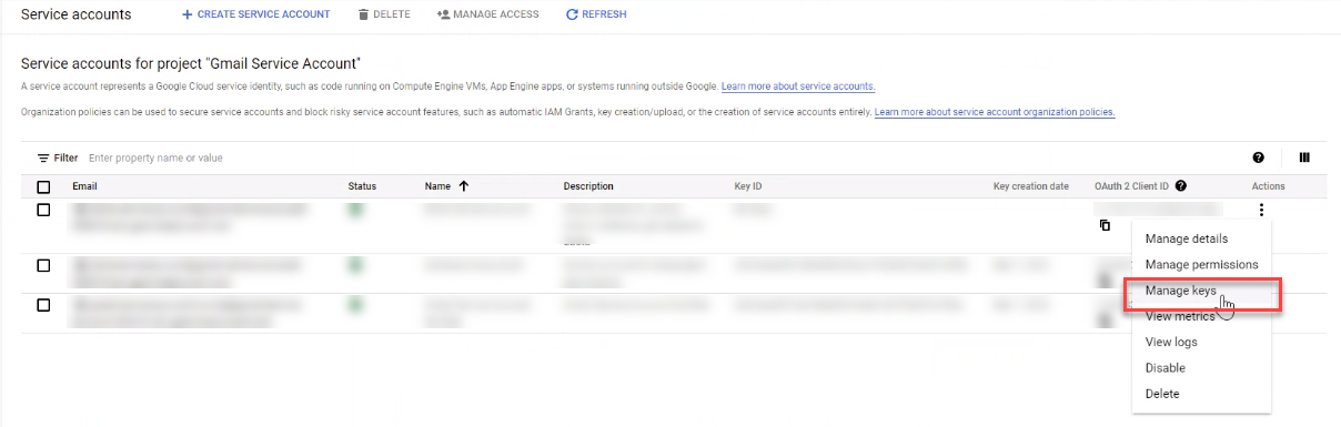 On the Service accounts page, under the Actions column, select the recently created service account then click Manage keys.