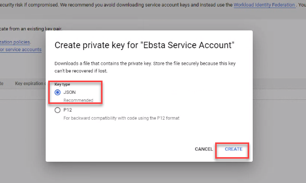 In the dialog box that appears, under key type click JSON then click CREATE.