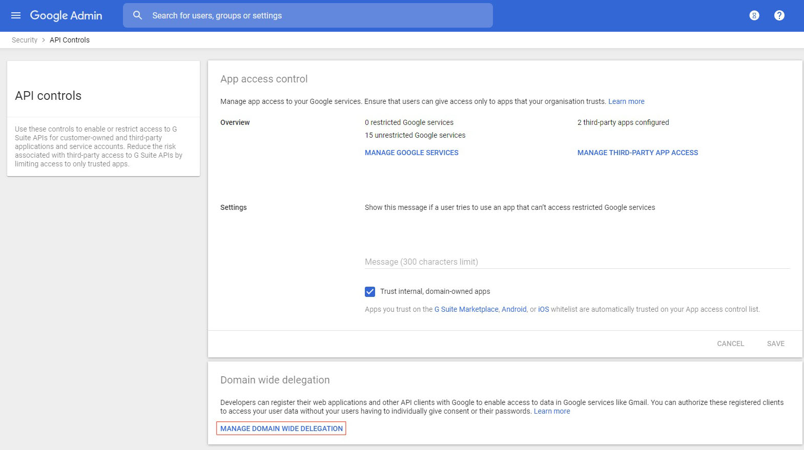 Click Manage Domain Wide Delegation.